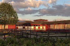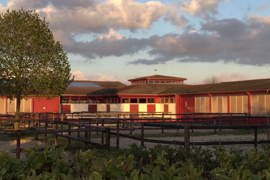 For daily training, there is a 1,450-meter natural racetrack, a 750-meter sand track, and an indoor riding arena. The timber-framed buildings with their colorful exteriors create a modern overall design that blends well into the surrounding landscape.