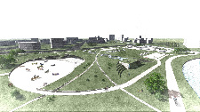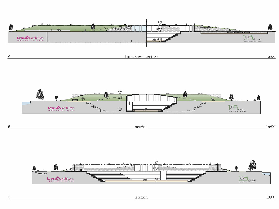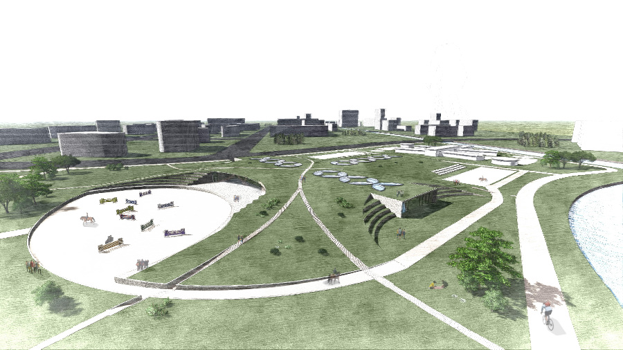 The above-ground landscaping, featuring floral motifs, allows natural light to penetrate the area below. Wavy walkways and overhangs form a natural amphitheater for the open-air arenas. The above-ground horse facilities occupy only 2.5% of the total area. Adapted to the urban setting, a recycling plant for composting horse manure was integrated into the design. These serve as natural fertilizer for the park's vegetation, thus protecting the environment.