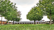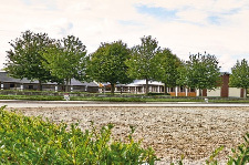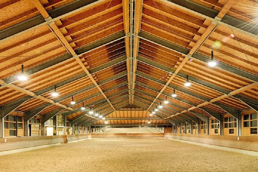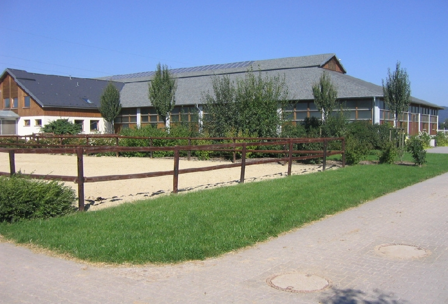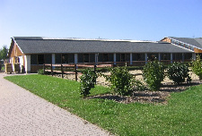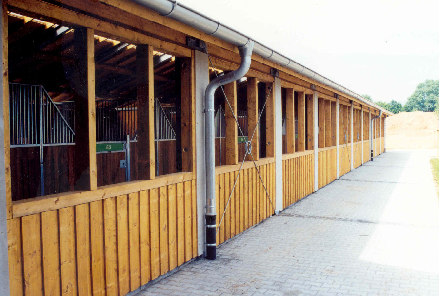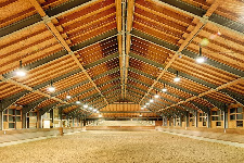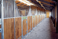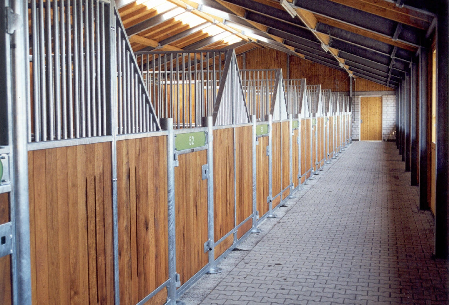 Three separate stable areas provide space for 60 horses. The adjoining indoor riding arena completes the well-rounded facility.