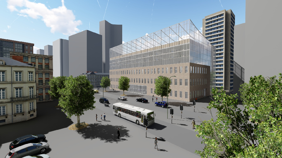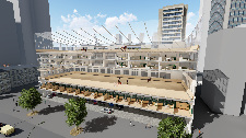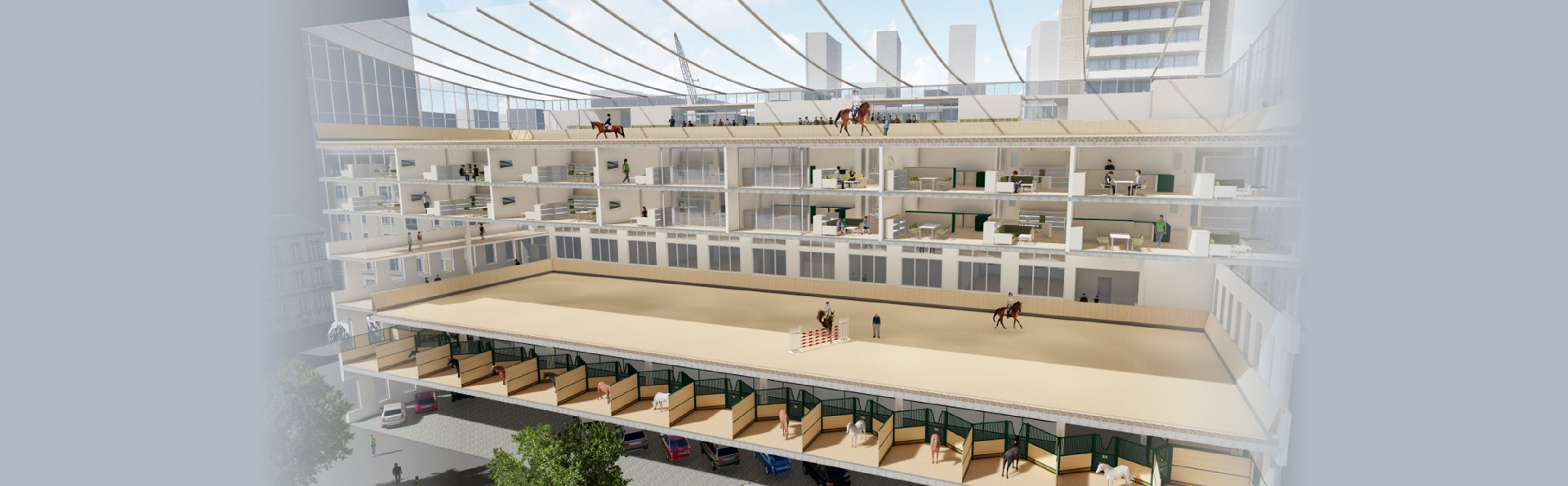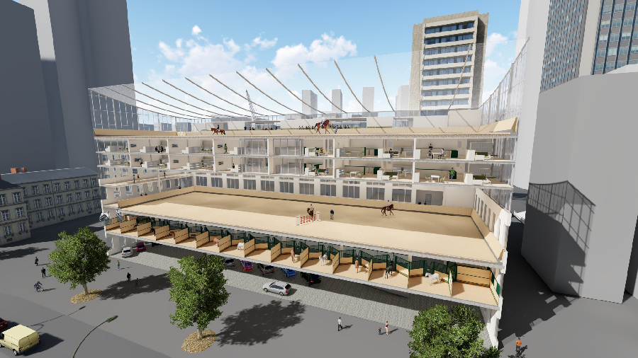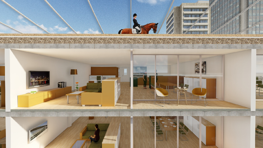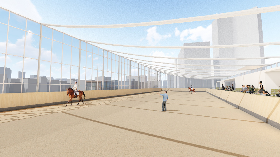 The high-rise comprises several levels, including an indoor riding arena and a rooftop riding area, as well as stables where the school horses are temporarily housed before returning to the rural riding facilities, the third phase of the project. Residential floors and parking garages give the building functionality within the urban environment.