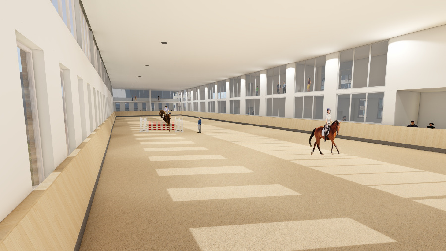 The equestrian high-rise is part of a larger project designed to introduce equestrian sports to residents of China's major cities. The high-rise is the second phase of the project. Here, riding students experience their first contact with horses, having acquired theoretical knowledge about riding principles, equine health, and horse care at the first phase.