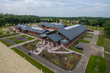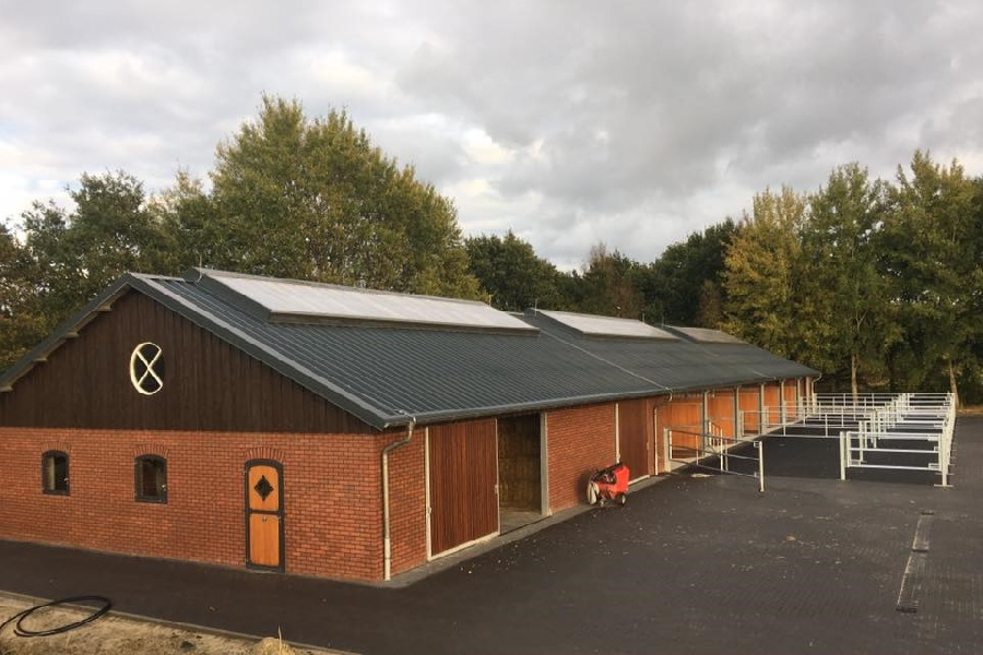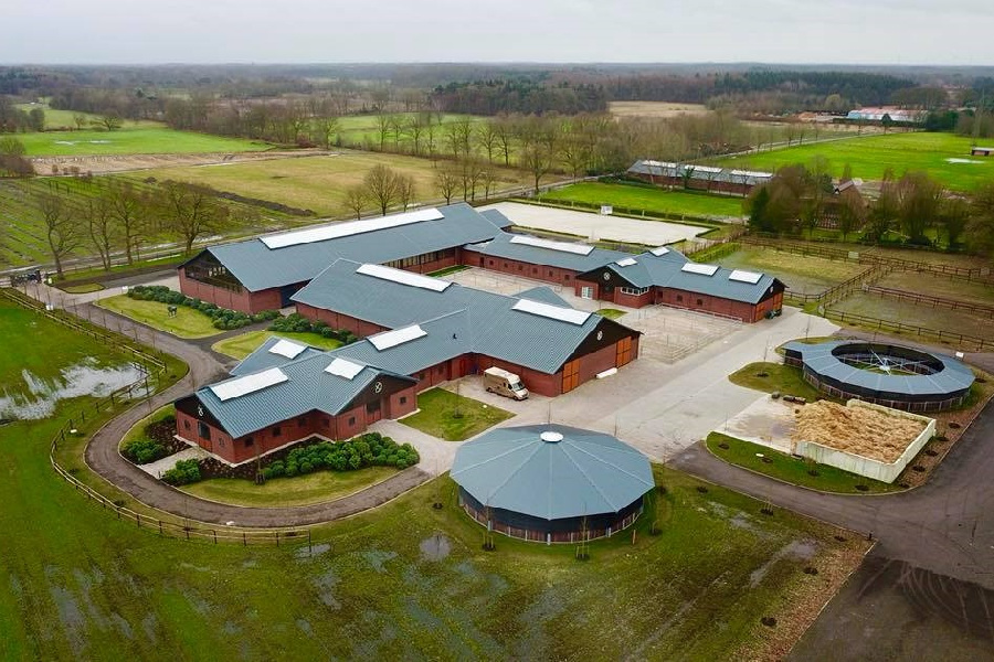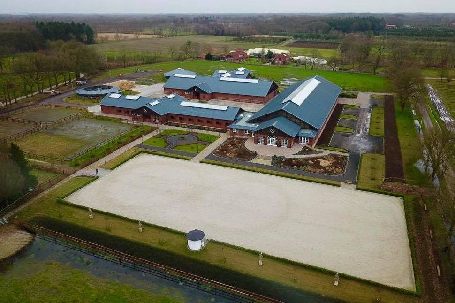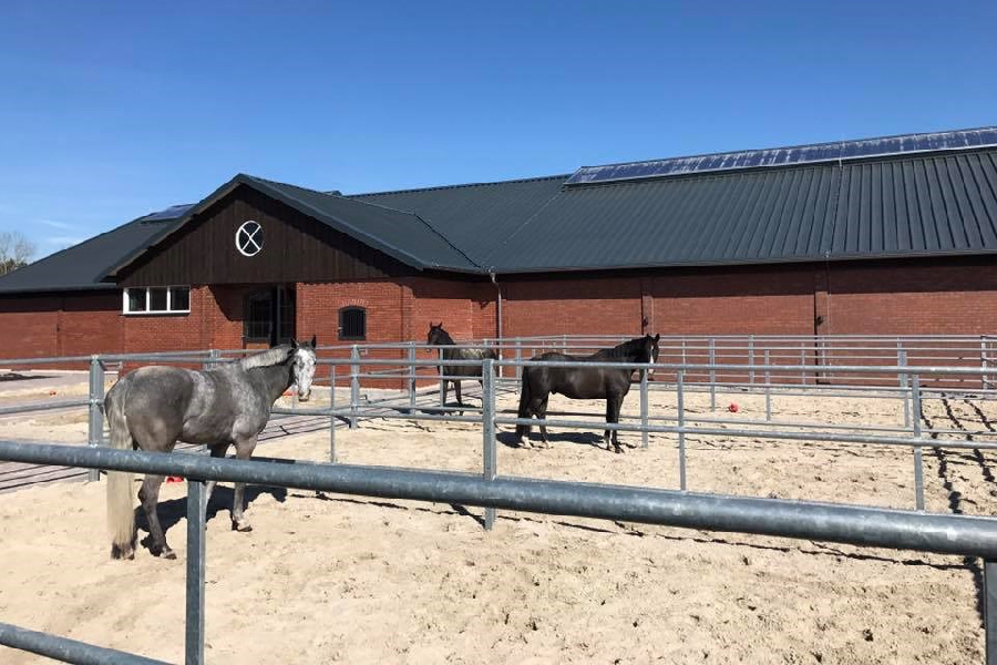 The Brune Stud Farm opened in Westerstede, Lower Saxony, in May 2017. National team rider Bernadette Brune realized her dream of a multifunctional facility. In addition to classical training of her horses, horses are also bred and raised here. The diverse buildings blend harmoniously into the landscape, characterized by tree nurseries and rural areas, respecting and integrating the existing farmhouse and the old farmstead with its mare stable.